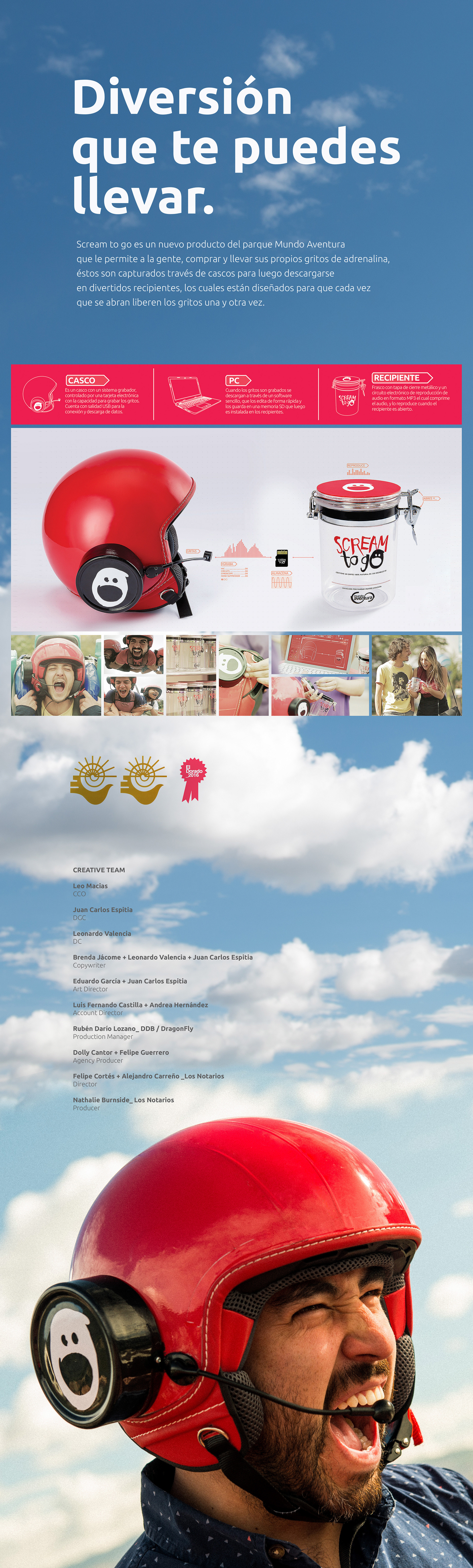 Scream to go es un nuevo producto del parque Mundo Aventura que le permite a la gente, comprar y llevarse sus propios gritos de adrenalina, y que son capturados través de cascos para luego descargarse en divertidos recipientes, los cuales están diseñados para que cada vez que se abran liberen los gritos una y otra vez. AWARDS: FIAP 2016 / BRONCE Innovación en Medios (Advertainment / Branded Content) FIAP 2016 / BRONCE Innovación en Medios (Promo, Activación y Marketing Directo)
